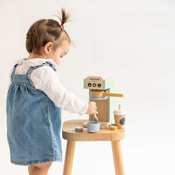 Este set de cafetera tan molón será el complemento perfecto para añadir a su cocinita favorita. Tu peque lo pasará en grande preparando las bebidas más deliciosas. Basta con elegir una cápsula, insertarla en la ranura superior de la cafetera, girar el cazo y ésta caerá en la tacita. Con su ruedita lateral que hace ¡clic! ¡clic! podrá elegir el café que servirá.
