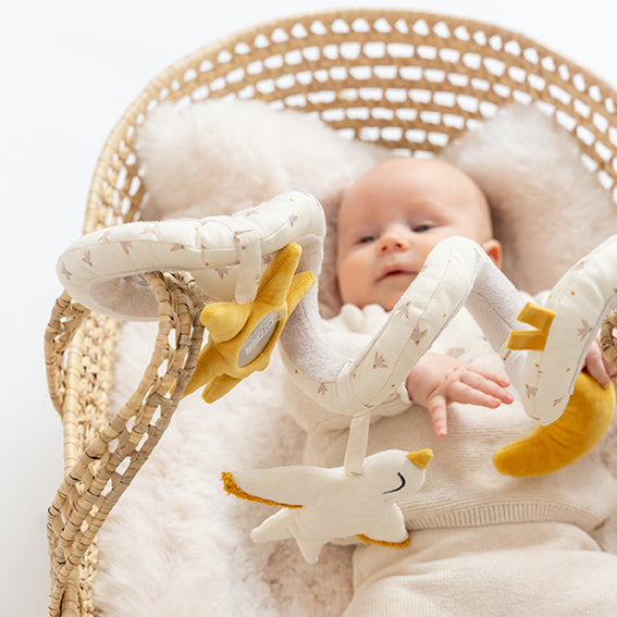 Um companheiro de brincadeiras inseparável que esconde segredos divertidos para estimular a imaginação. Pode enrolá-lo no berço, no carrinho de bebé ou em qualquer outro lugar, entretendo o seu bebé onde quer que ele esteja.